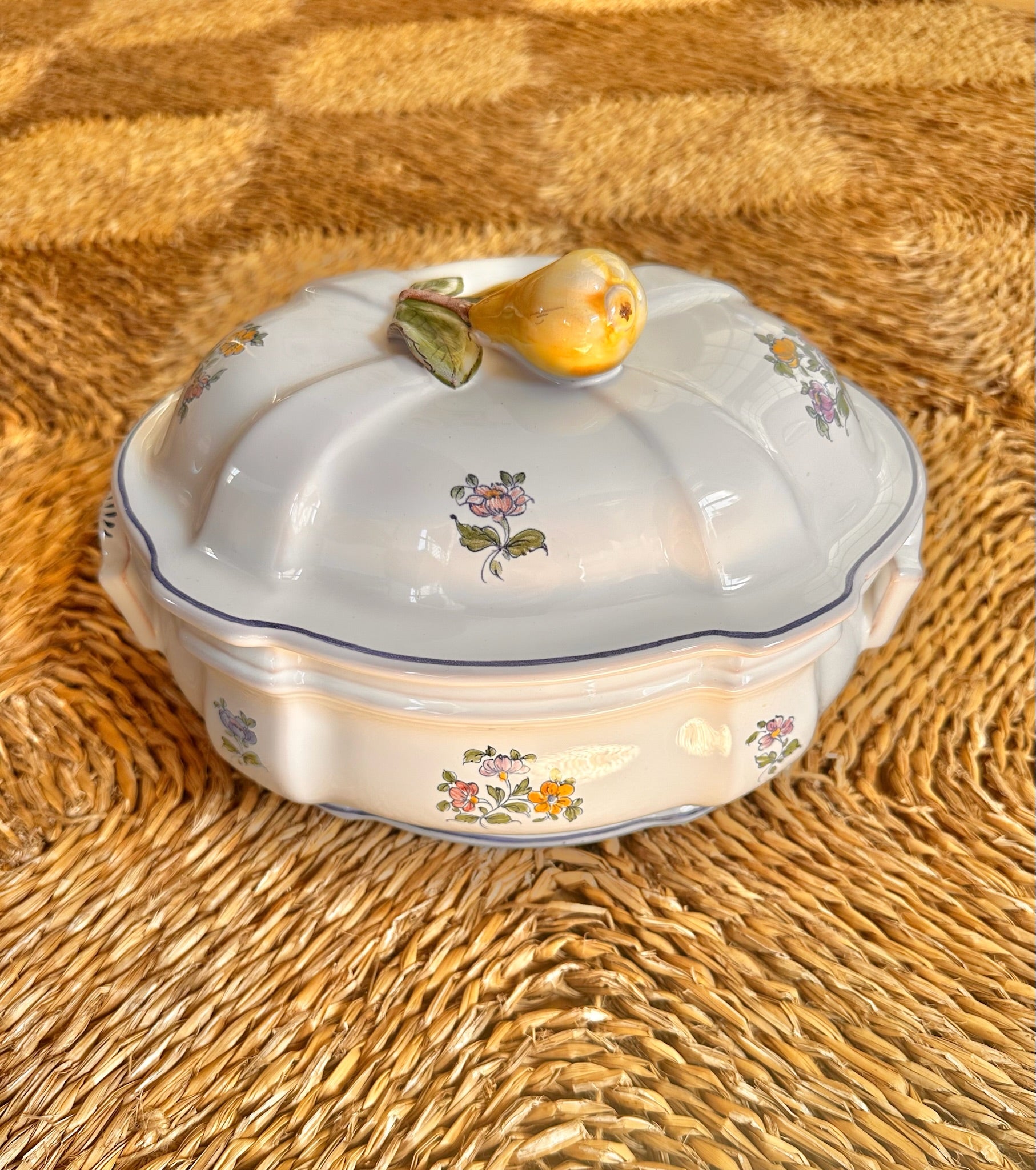 Our vintage Pierre Deux Porcelain Terrine with Pear Handle and Matching Platter are carefully sourced from the 80s.